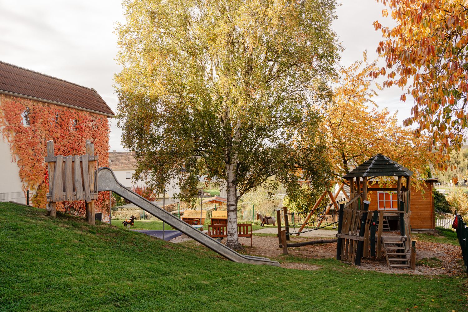 Die großzügigen Gruppenzimmer sind direkt mit dem Spielplatz verbunden, der mit seinen rund 800 m² viele Möglichkeiten zum Entdecken und Bewegen bietet. Ein Turnraum lädt zum Spielen und Ruhen ein, und der Sportsaal der Mehrzweckhalle wird regelmäßig für Bewegungseinheiten genutzt.